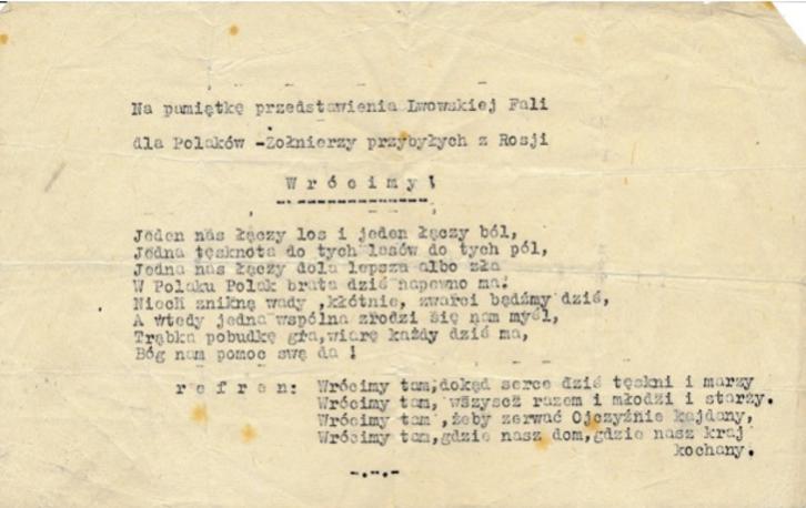 Na pamiątkę przedstawienia Lwowskiej Fali dla Polaków -Żołnierzy przybyłych z Rosji. W r ó c I m y Jeden nas łączy los i jeden łączy ból Bóg nam pomoc swą da. | A souvenir from the performance given by Lwowska Fala for Poles - Soldiers who had arrived from Russia.