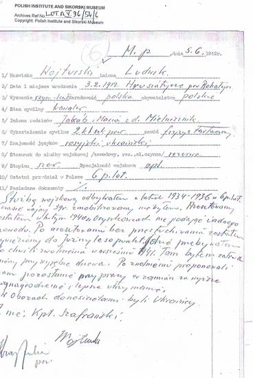 “In the month of October 1939 I was in German internment from which I returned 20th December 1939. I stayed home for three days in which time in Oryzkowice town hall, from where I lived, meetings were held by Soviets to which under a threat of confiscation of my land I had to attend. There were Soviets, Jews and Ukrainians who constantly shouted away with pany (lords) and Poland. In a role of a main speaker was unknown to me a Soviet man who often referred in his speech that Poland will never rise up and should be considered lost. Next I present facts of my arrest by NKVD. In the night at 24th hour, under the threat of death it was ordered for me to open the door. At that time walked in two NKVD’s who under the pretext of searching for firearms, turned the house upside down and also a bed on which my dying wife was laid. This was done in a very barbaric and inhumane way. After the search I noticed the absence of a watch (clock) and two wedding bands, that way the NKVD conducted searches. Before dawn they arrested me and took me to a prison in Lwow for fourteen days and without sentencing me took me to USSR where they accused me of co-operation with Polish police, and that was a reason for arresting me. After serving one and a half years, on news of an agreement of General Sikorski I was released”.