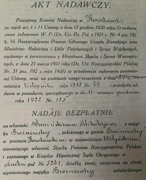 I am from Osada Listopadówka, formed by the partitioning of an estate Swiniuchy [Translator’s note: The AKT NADAWCZY - Deed of Land Endowment shown below refers to Świniuchy] in Horochów district in Wołyń.